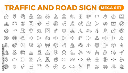 Road and traffic line icons collection. Street, transport, fuel, vehicle, location, car service icons. UI icon set. Thin outline pack. Way direction arrow sign. Roadsigns. Outline icon collection.