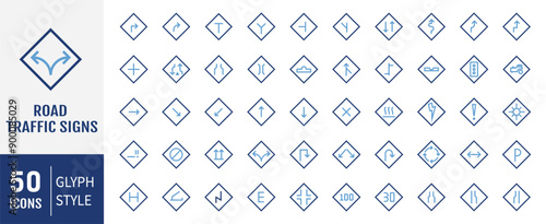 Set of 50 road traffic signs set. Collection of warning, mandatory, prohibition and information traffic signs. Solid icons vector collection.