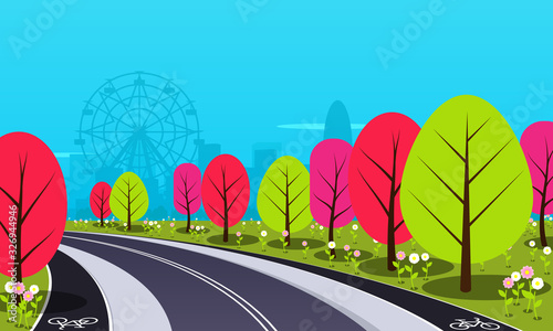 Curved empty road through the woods with bike lane. Spring landscape vector illustration.