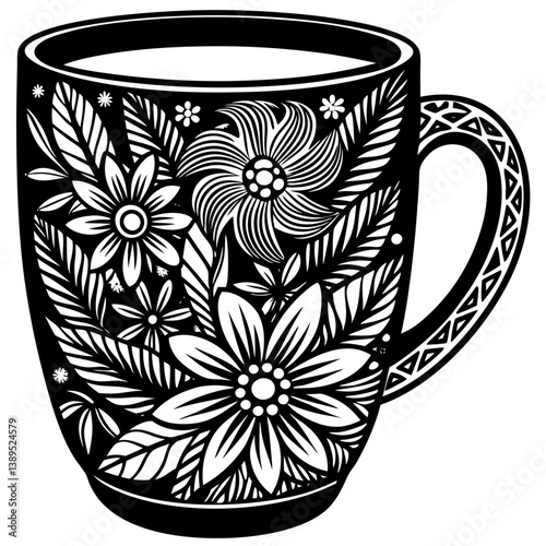 cup of coffee or tea ink contour drawing black and white