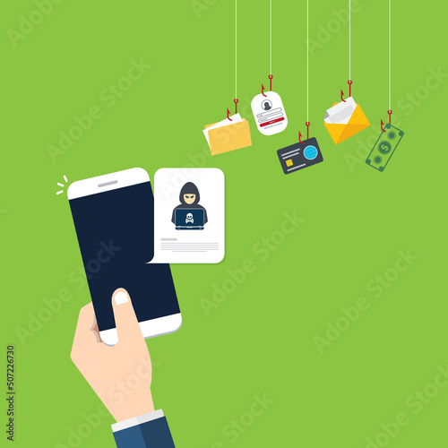 Hacker, malware notification on mobile phone. Smartphone with hacker alert, spam data on cellphone fraud error message, scam, virus.