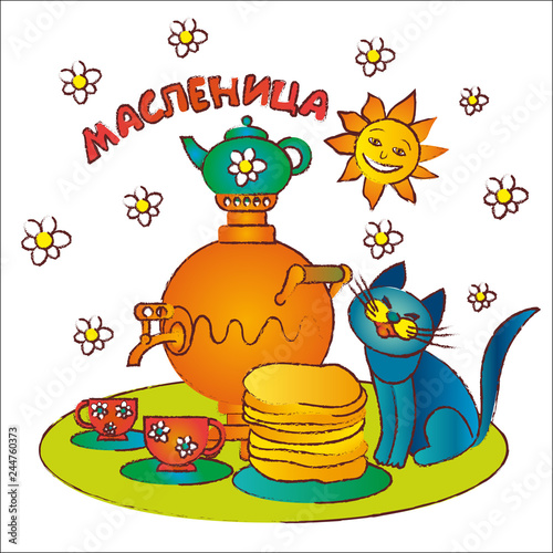 Maslenitsa in Russian language, hand drawn vector illustration  Cyrillic.T shirt print, postcard, banner design element.