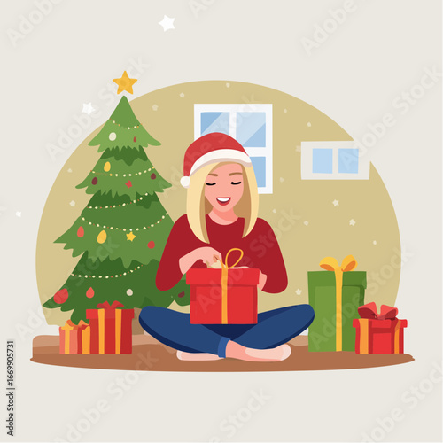 Vector flat fashion illustration of a young blonde girl with long hair in a dress with bare shoulders.