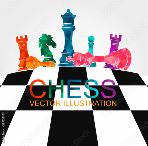 Colored chessmen set. Different chess figures. Patterned knight, bishop, rook, king, queen, white pawn. Intelligence leisure, strategic sport game, tactic boardgame. Flat isolated vector illustrations