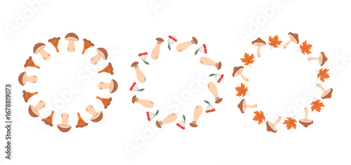 Autumn leaves and mushrooms border a clean white background, capturing the essence of fall nature and harvest season.