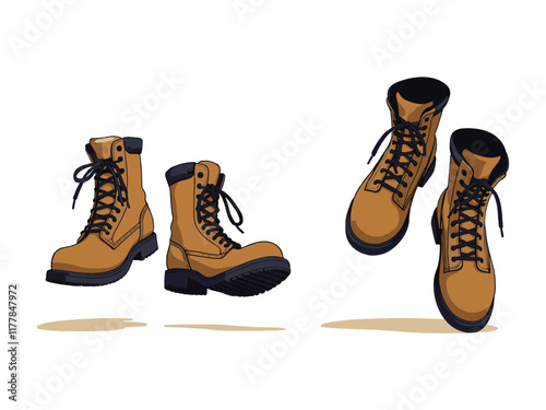 Hand-drawn vector illustration of various styles of boots showcasing different angles and lacing techniques for fashion and outdoor design projects