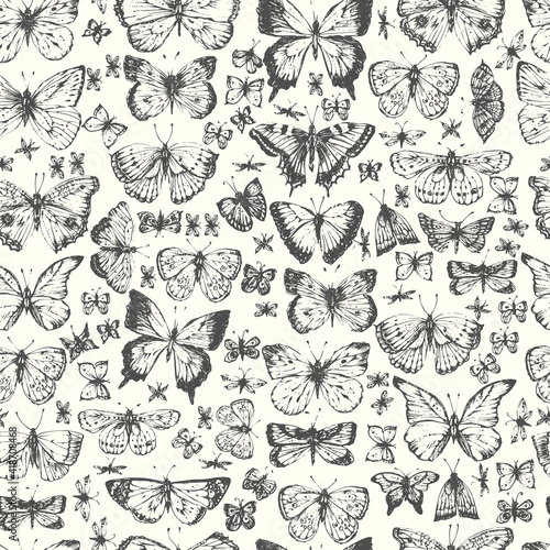 Hand drawn ink line art butterfly seamless pattern