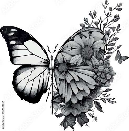Half shape butterfly and skull, heart and snake with branch and flowers for tattoo t-shirt print or wall art. Hand drawn wedding herb. Botanical rustic trendy greenery. Vector
