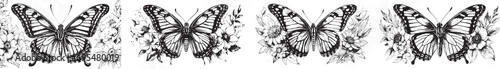 Set of flower butterflies. Collection of ethnic beautiful flower arrangements with insects. Botany. Vector illustration for trendy t-shirt design. Line art. Tattoo.