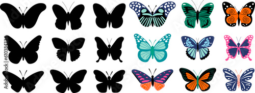 Butterfly collection. Drawing butterflies, silhouette and color flying insects. Spring animals, wild meadow or forest characters vector set