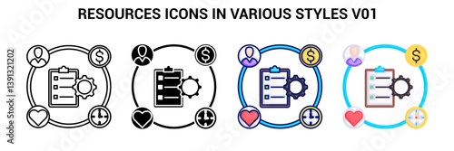Operational Resource Icons. Operational Resource Symbols linear icon set: resource grid, supply buckets, allocation paths, capacity dial, progress block, workflow arrows, planning