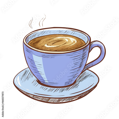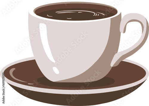 Illustration of six coffee cups with varying designs and shades on saucers against white background | editable eps vectors silhouette
