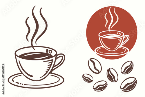 Illustration of a steaming coffee cup on a saucer with coffee beans beside it on a cream background