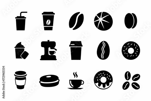 Set of various coffee icons featuring cups, beans, and a grinder for beverage themes