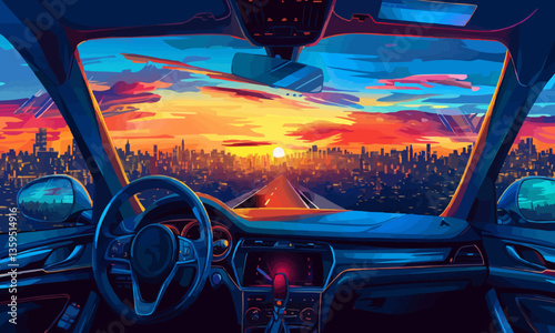 Man driving a car rear view. Trip late at night. Vector illustration