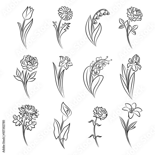 A collection of 18 simple line art flower drawings, suitable for coloring book pages. The flowers include lilies, roses, daisies, and more.