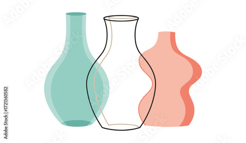 Three antique ceramic vases in a still life arrangement. Vector hand drawn illustration