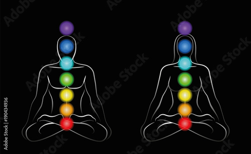 Chakras: muladhara, swadhisthana, manipura, anahata, vishuddha, ajna, sahasrara. Vector line symbol. Om sign. Silhouettes of the man and woman in a lotus pose. Smoky circles. Sacral icon. Meditation