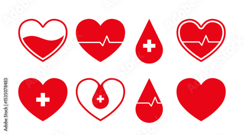 Collection of vector icons illustrating blood donation and heart health concepts.