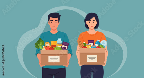 Man and woman holding charity donation boxes filled with various food and essential items, showcasing community support and the spirit of giving, rendered in a modern vector illustration style