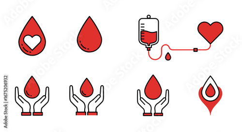 Isolated Red Blood Donation vector icon set, Charity Blood sharing, Health care and Volunteer graphic elements, symbol.