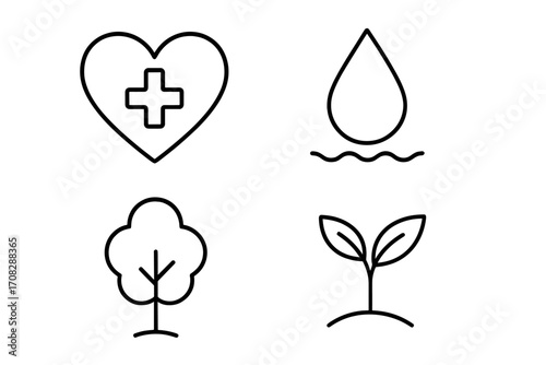 Health care and nature line icon set. Minimalist symbols of medical cross, water drop, tree, and plant sprout. Vector design elements for eco, wellness, and growth concepts.