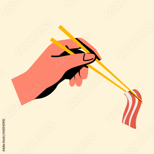 Hand holding chopsticks vector isolated on white background.