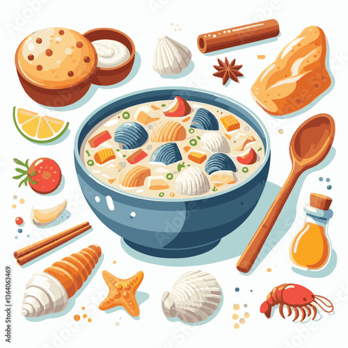Flat vector icons of hygge-inspired spaces: chunky knit blanket, cozy candles set, steaming mug, fuzzy socks icon, warm lighting string, comfort chair, stack of novels, fireplace nook.