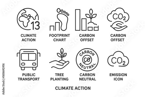 Set of eco-friendly icons for sustainability. Linear vector symbols for recycling, CO2 reduction, and green planet. Environmental conservation and ecology concept design.