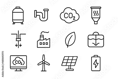 Carbon Capture Icon Sheet: A comprehensive icon sheet visualizing the essential elements of carbon capture technology, each carefully designed to represent different facets of the process.