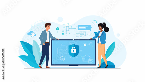 Teamwork and Cybersecurity Vector Illustration – Collaborative Workflow with Gears, Secure Data Protection, Cloud Computing, and Digital Privacy Icons for Business Technology and IT Solutions.