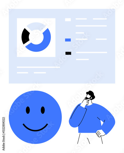 Education, decision-making, data analysis, brainstorming, creativity, business strategy. A woman contemplating with a pie chart, question mark and plant. Education and decision-making concepts
