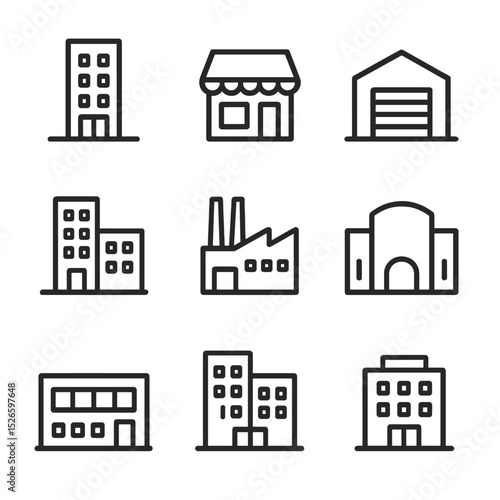 Commercial Real Estate Icons. Line style round icons of commercial real estate: office building, retail space, warehouse icon,