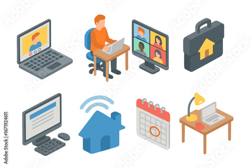 Line style icons of hybrid work at cowork: virtual meeting room, laptop dock station, headset + workspace icon, cloud sync tools, flexible hours tracker, part-time coworking tag, hybrid desk badge,