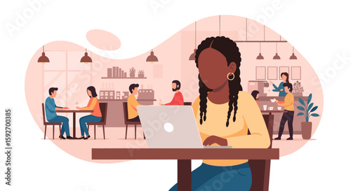 Person working on laptop in a cafe, ideal for illustrating remote work, coworking spaces, or freelance lifestyle.