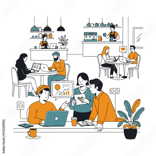 People working diligently on laptops in a modern, plant-filled coworking space. Represents productivity, collaboration, and remote work lifestyle.