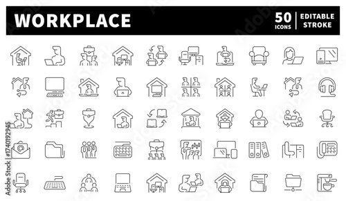 Workspace icon set. Contains  icons related to Workspace and office, coworking. Equipment and furniture. Outline Icon Collection. Vector illustration. Editable stroke
