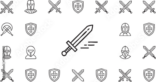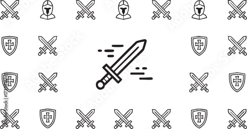 Medieval knight illustration, crusader armor, religious warrior, sword, helmet, cross symbol, historical costume, vector art, silhouette, battle pose