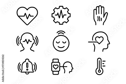 Pet Interaction Icons. Pet Interaction Dynamics linear icon set: body-language cue card, relaxed tail curl, focus gaze mark, friendly approach arc, stress-relief shake, adaptive