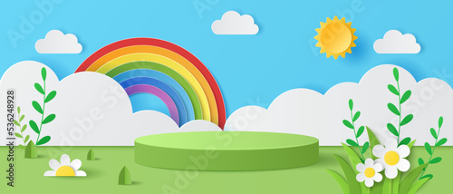 Paper cut of Summer season on green nature landscape, sun,  clouds, rainbow, flower with cylinder podium for your products display presentation