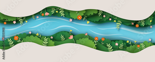 Swamp landscape with flowers. Spring natural landscape. paper cut and craft style. vector, illustration.