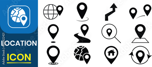 Location icon set. Home, location, globe, information, support, search, navigation, satellite, compass. Point vector illustration sign collection.