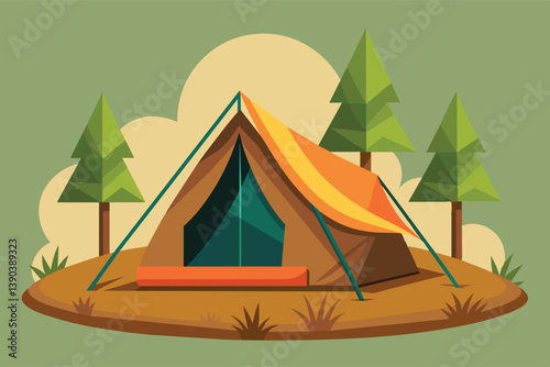 Colorful illustration of tents and campfire under starry night sky with crescent moon in forest clearing with camping and stars