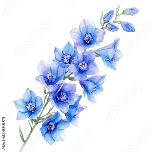 Delphinium Flower, clipart watercolor vector with vivid accents and harmonious tones, isolated on a white background.