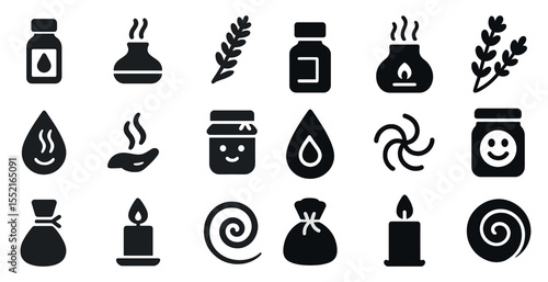 Aromatherapy And Fragrance Diffuser Solid Icon Set. Relaxation, Wellness, And Home Scenting Silhouette Symbol Collection. Essential Oils, Candles, And Incense. Isolated Vector Illustration