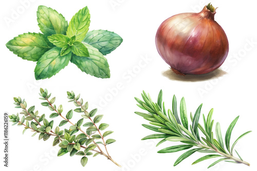 Collection of hand drawn botanical illustrations of herbs and leaves in various colors
