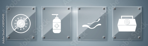 Set line Rabies virus, Virus, Ebola disease, First aid kit, Test tube with, Bar of soap, and icon. Vector