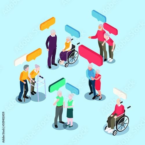 Bundle of disabled elderly people with chat bubble isometric 3d vector illustration concept for banner, website, illustration, landing page, flyer, etc.