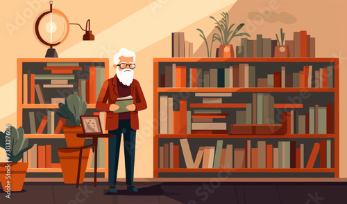 Old man sitting on armchair, watching TV and resting. Positive senior spending time at home. Happy old age. Concept of happy retirement. Flat vector illustration in cartoon style