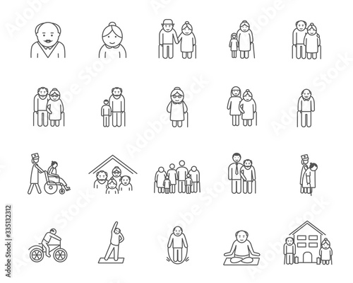Aged care vector line icons set. Aging, Care, Elderly, Assisted, Supportive, Nursing, Retirement illustration outline concept symbols and signs
